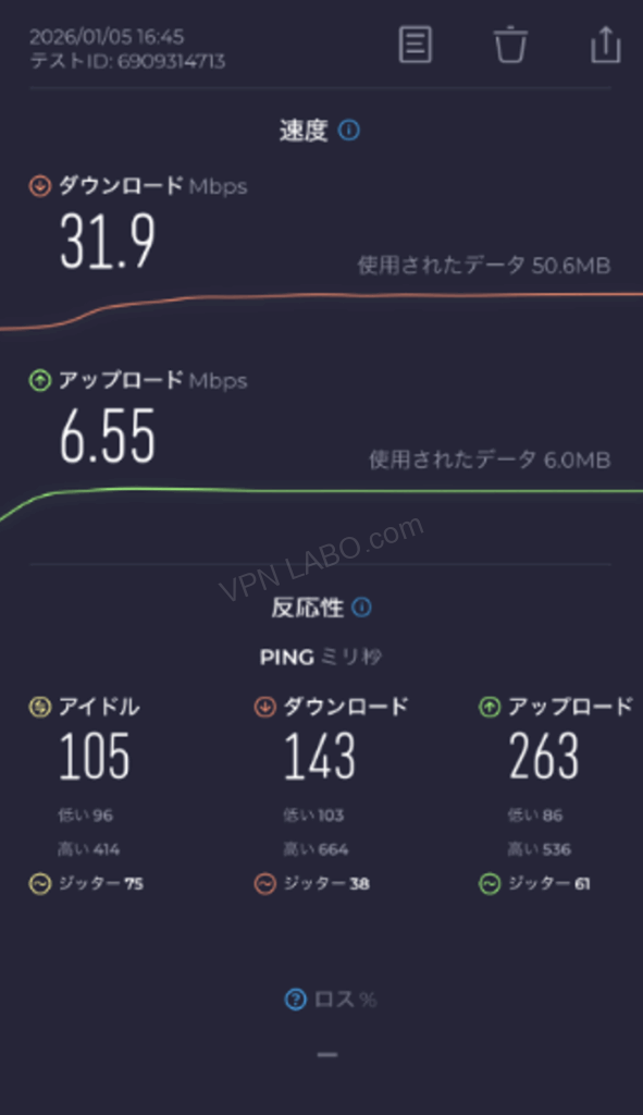 ではお次にiPhone+5GSIMでのテストをしていきましょう。VPNなしのネット環境は良好です。