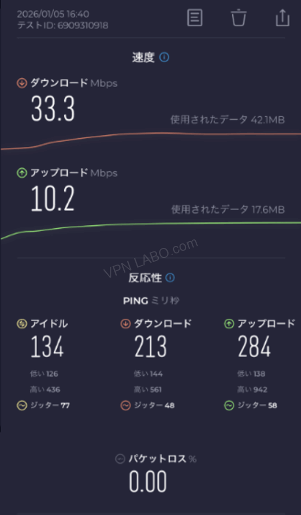 まずはパソコンでのテストをしていきます。VPNなしのネット環境は良好です。