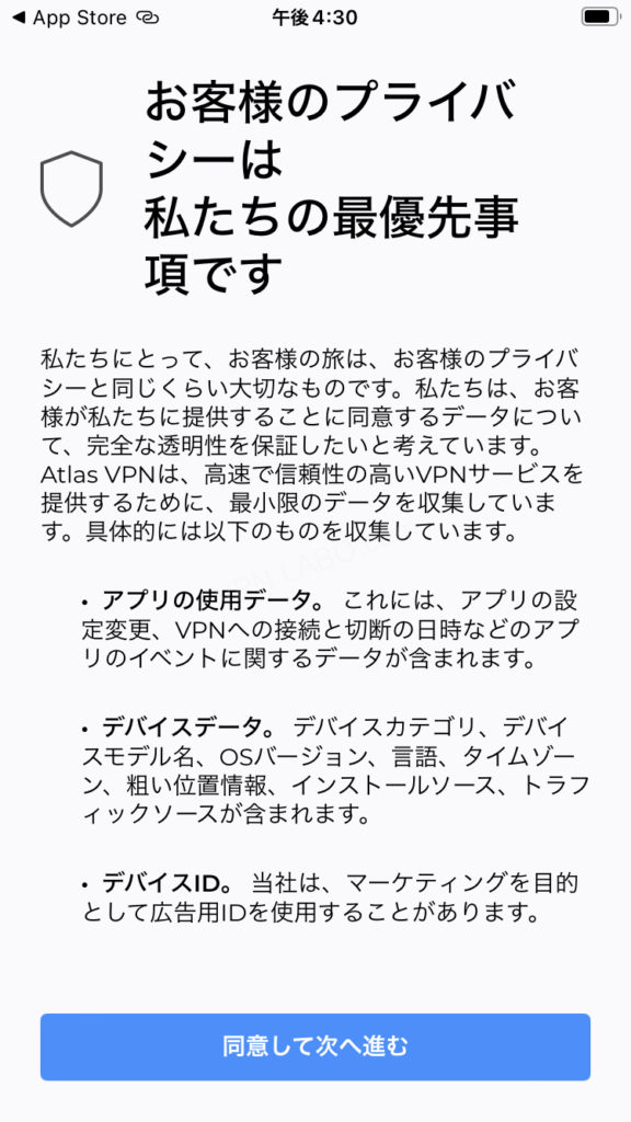 以上、Atlas VPNの初期設定(iPhone版)の方法でした。