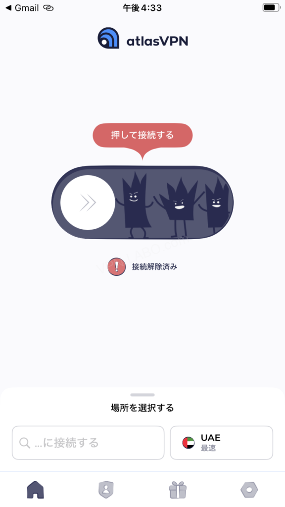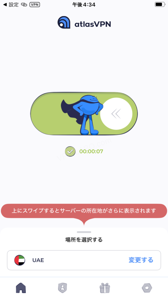 VPNのオンとオフは画面上のボタンをタップするだけ。