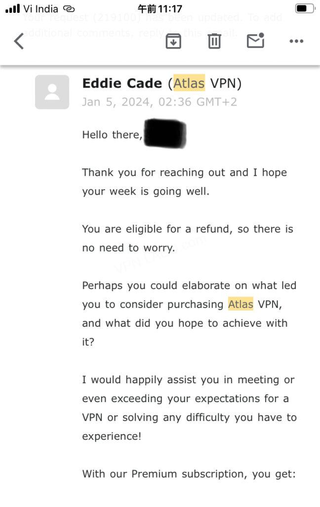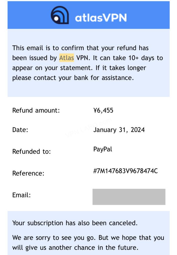 このように、最初のメールに返信しないと返金されないようです。皆さんもAtlas VPNの返金申請の時には気をつけてください。