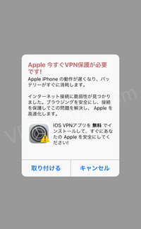 「Apple iPhoneがハッキングされています。 VPNをアクティブ化するためにアプリをインストールしてください。」