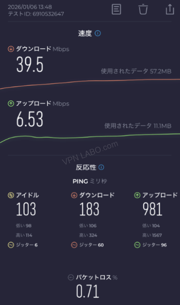 パソコン(Windows)+Wi-Fiでの接続状況でした。数値的にはあまり良くないですが、実際の体感はそれ以上に快適に感じる速度が出ていました。