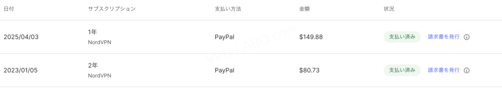 実際のNord VPNアカウントの請求履歴画面です。上の段が2年プランが終わった後の自動更新した時の支払いで、1年で149.88ドル(12.49ドル/月)になりました。
