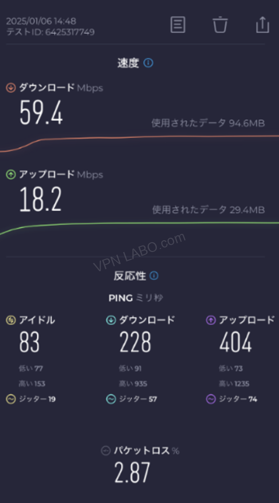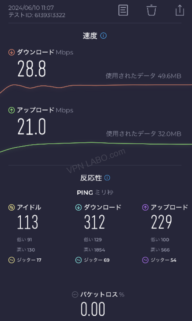 パソコン(Windows版)での接続状況でした。今月の良之助VPNは、相変わらず快適に使用できています。数値もまずまずです。
