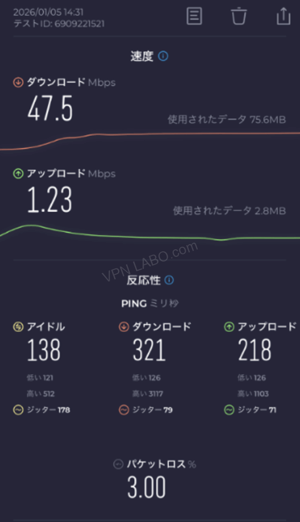 パソコン版のテスト結果でした。今月のスイカVPNは前回に比べて遅かったです。ダウンロードの数値はいいのですが、Ping値があまり良くないですね。でも比較的快適には使えました。