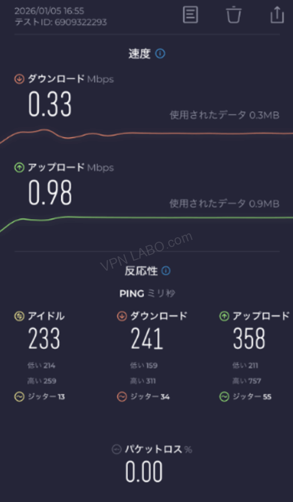 iPhoneでの速度テスト結果を見てみましょう。VPNなしのネット環境は良好です。